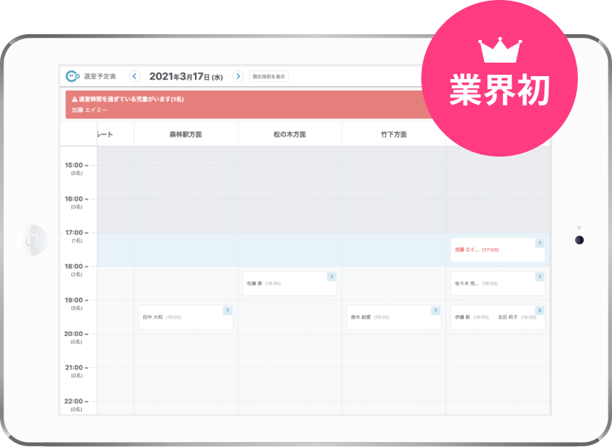 出席簿に加え、送迎に関するミスを確実になくすために、「入退室予定表」も自動生成されます。誰がいつ帰るのかを時系列で一覧表示し、さらに入退室予定時刻を過ぎても入退室の打刻がされなかった場合はアラートが鳴ることで、「くるはずがきていない」「帰るはずが帰っていない」などが一目で把握でき、送りそびれの発生を防ぎます。
