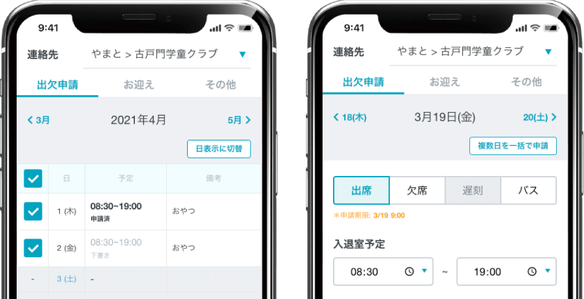 保護者から次月の入室予定日の申請を受けたり、直前の欠席やお迎えの連絡、入退室方法(どこに送迎するかなど)、おやつ有無などを受付したりすることができます。