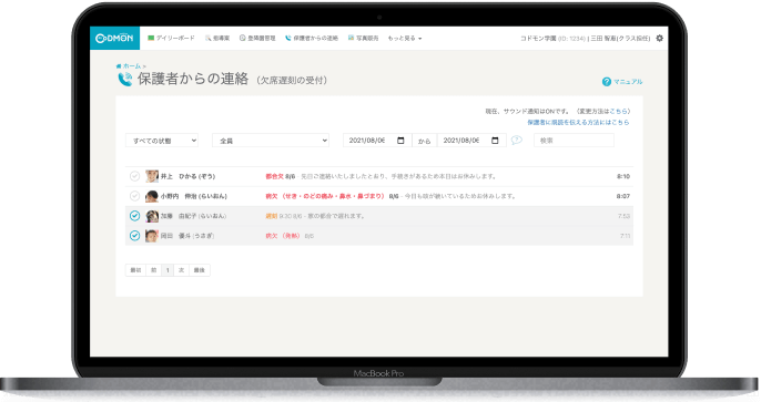 コドモンのアプリは学校から保護者へ、個別・一斉に連絡できるだけでなく、 保護者からの連絡は確認すると既読の通知が保護者に届くため返信業務も省力化できて便利です。 保護者からの連絡が全部コドモンに入ればもっと先生同士の共有が進み、先生個人が抱え込んで悩むような負担を軽減できるのではないかと思っています