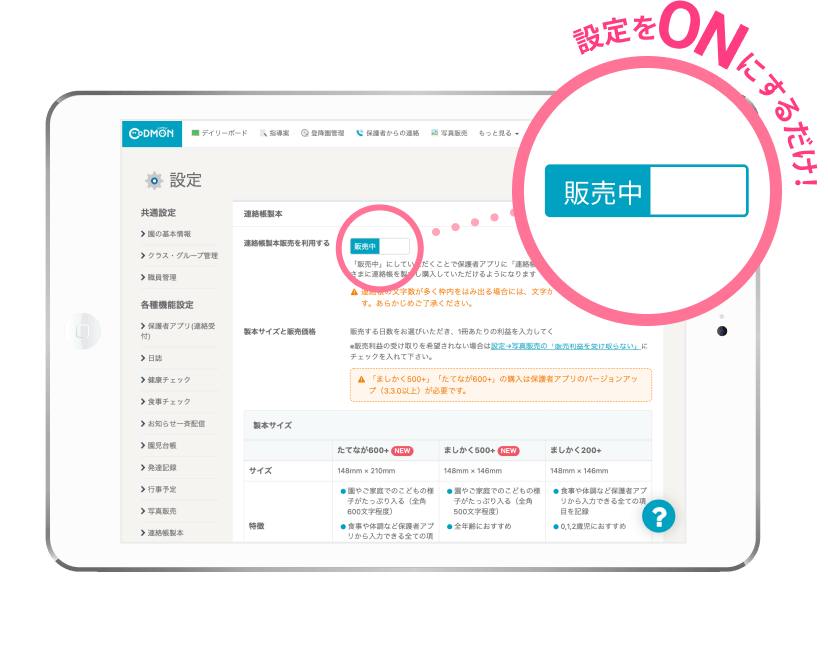 なら 施設はコドモンの管理画面で「連絡帳製本」をONにするだけ。