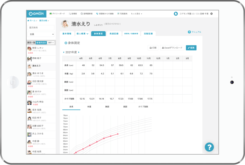 身体測定はコドモンベーシック(基本利用料)に含まれており、