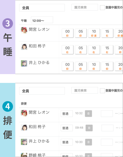 登園している園児のみを表示し、記録することができるので、入力のミスや負担を軽減することができます。