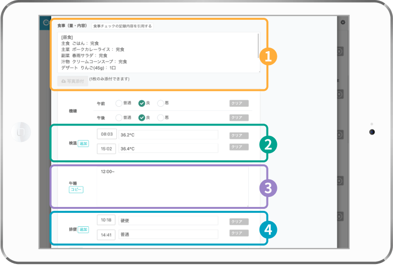 検温・排便・午睡・食事データが自動転記され、入力の手間を削減。