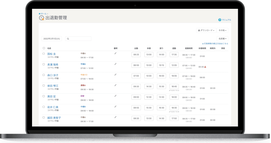タイムカードの煩雑な運用から解放されました。交代制の時間管理や社員とパートの組み合わせなど、従業員の煩雑な勤怠管理がコドモン一つでできるようになりました。
