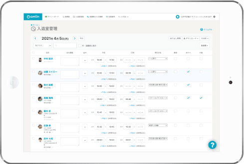 登降園 / 入退室管理と同じタブレット端末を使って、職員の勤怠管理を行うこともできます。シフトとの連携や他社の給与システムとの連携も簡単です。
